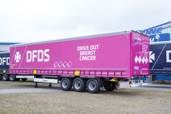 DFDS has ditched its regular scheme by turning out one of its trailers in bright pink in support of the fight against breast cancer. For every ten kilometres it ravels, DFDS donates one euro to medical institutions.