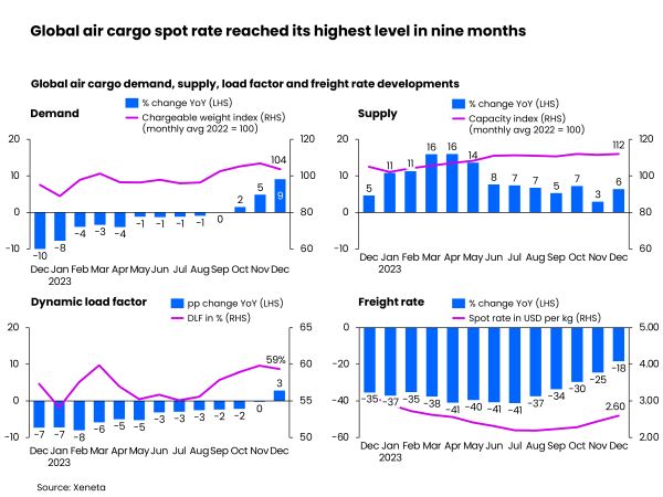 [ January 3, 2024 // Chris Lewis ]The start of 2024 may herald the start of a new economic growth cycle for air cargo after last year ended with a +9% year-on-year rise in demand and the highest general spot rate in nine months, suggests the latest weekly market data analysis by Xeneta.