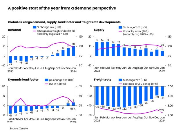 [ February 1, 2024 // Chris Lewis ]Global air cargo volumes rose by a surprise but welcome 10% year-on-year in January as concerns over hostilities in the Red Sea and an early Lunar New Year more than compensated for an anticipated post-Christmas drop in ecommerce traffic, according to the latest weekly market analysis by Xeneta.