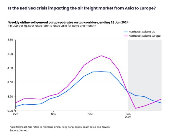 Although the Red Sea crisis will not directly impact e-commerce volumes, it did contribute to some growth in air cargo demand into Europe in January as ocean shipping carriers rerouted vessels to avoid the threat of militia attacks, increasing transit time, driving up costs, and raising concerns over potential container shortages.