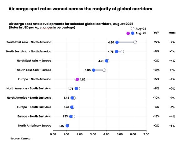 Consider China-US air cargo, for instance, which, in August, was priced at $4.30 per kg. Many e-commerce shipments have been re-directed to the China-Europe corridor due to US de minimis bans, where the rate was $3.65 per kg. Such reallocation drags down the global average. A -7% drop in jet-fuel prices may have also helped keep airlines’ costs down, muting pressure on rates for now.