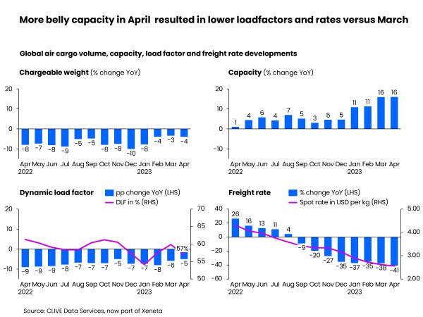 [ May 9, 2023 // Chris Lewis ]The air cargo market may have to wait until October for a recovery after a flood of summer bellyhold capacity on major lanes and a -4% drop in demand in April, according to the latest weekly analysis from CLIVE Data Services, part of Xeneta.