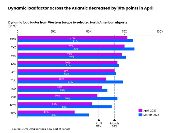 Summer capacity had its traditionally profound impact on the air cargo market from Europe to North America, with capacity up 26% in comparison to March 2023. Data showed a 10% pts decrease in load factor across the North Atlantic to 57% last month, compared to the 67% level recorded to major North American airports in March. This pushed the general airfreight spot rate on this westbound lane down to US$2.29 for April.