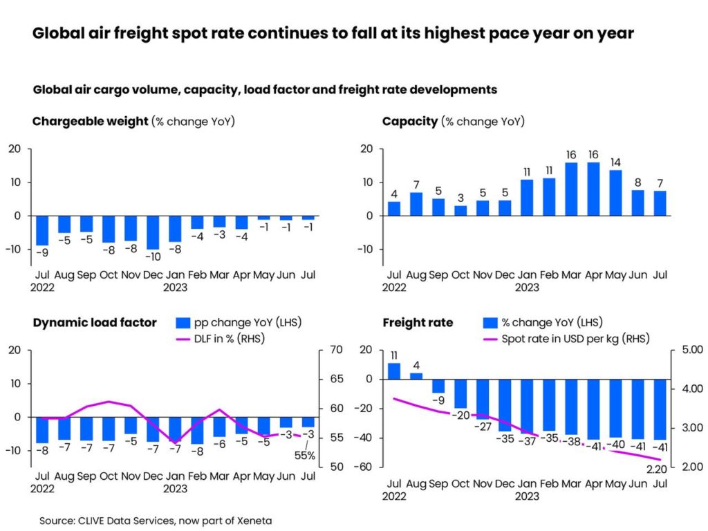 Clive, part of Xeneta, said that after another month of falling demand in July saw volumes drop -2% month-over-month, and the general global air freight spot rate decline at a hastening pace of 40% or more for a fourth consecutive month.