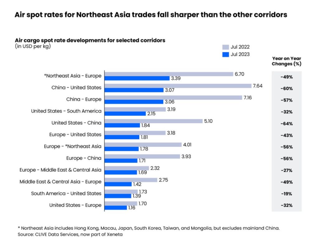 Northeast Asia (including China) trade lanes registered the biggest rate declines compared to last year. Both China to the US and US to China airfreight spot rates fell by over 60% from a year ago. China to Europe and Europe to China took the third and fourth places, with spot rates down over 55% year-on-year.