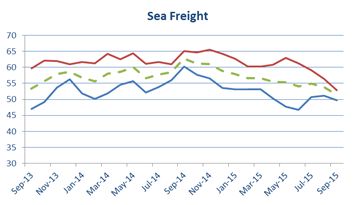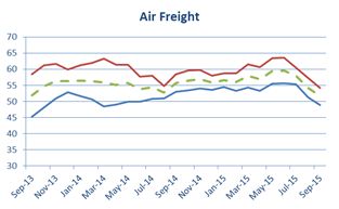 The six-month outlook shows a fall of 3.3 points and expectations for the sea freight market are even bleaker. The loss of 3.5 index points in a month put the Logistics Expectations Index for sea freight at 52.9, 12.2 points below the confidence levels of September 2014. Just a single lane saw growing confidence in September, the US to Europe lane which rose 0.4 points to 48.2. The Europe to Asia and Asia to Europe lanes both saw a 2.3 point decline to 48.7 and 54.1 respectively. The Europe to US lane fell 0.9 points to 47.6.