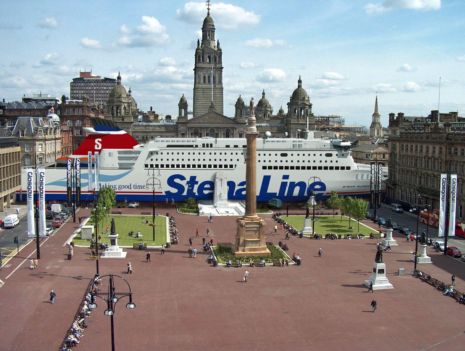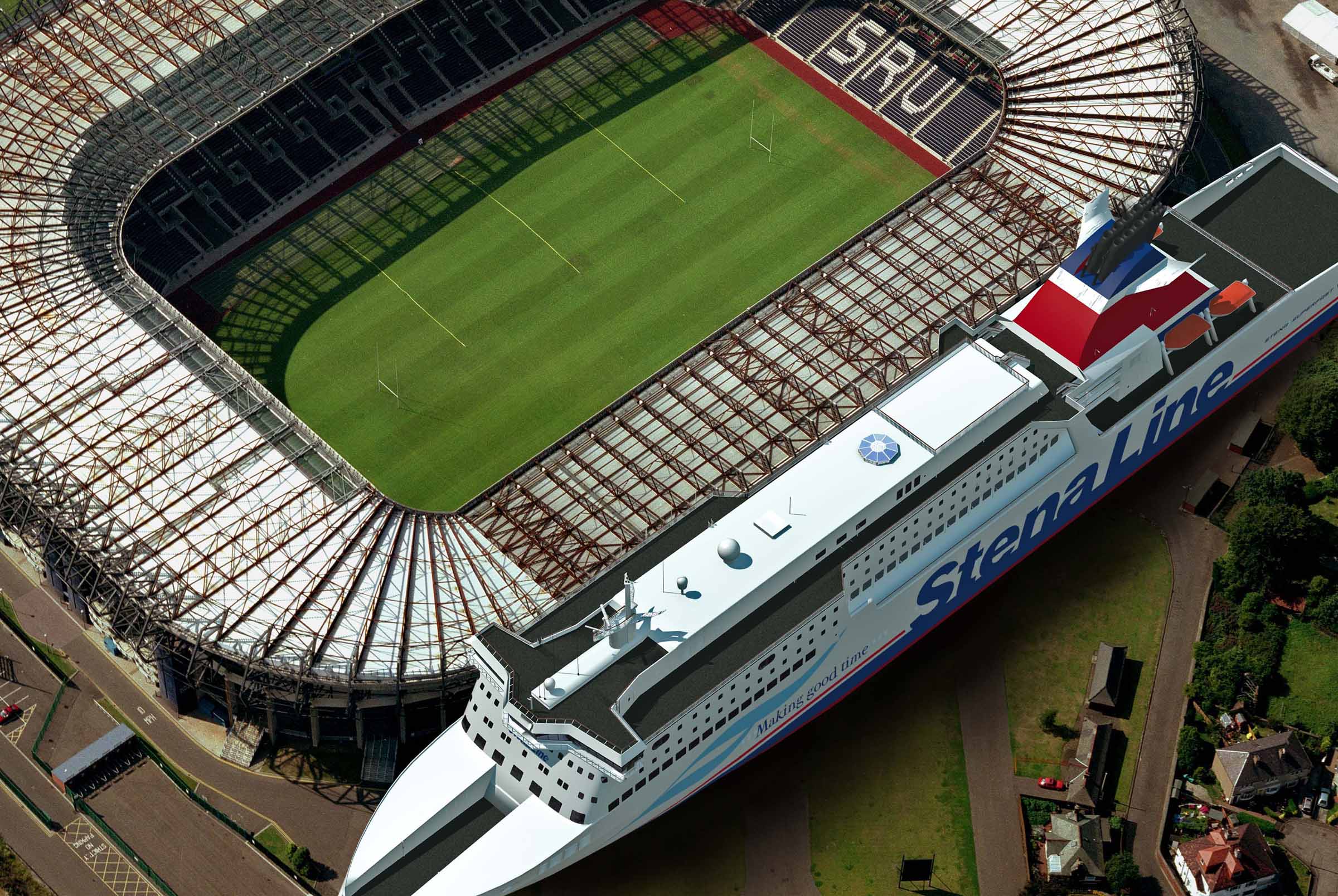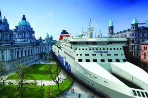 Not Stena’s idea for a city centre ferry service – it’s just one of a series of artist impressions of how one of the new ferries soon to be introduced on Stena Line’s new Cairnryan/Belfast would look if it moored next to well known local landmarks. Thes Stena Superfast VII and Superfast VIII are scheduled to start operating on the Irish Sea on 21 November and will be the biggest ferries ever to have sailed between Scotland and Northern Ireland. Each ship can take 110 freight units, plus passengers and cars.