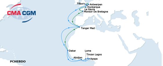[ December 9, 2013 // Chris ]CMA CGM Group will make a major reorganisation of its services between North Europe, the Med and West Africa from mid-December including the addition of UK and Nigeria calls on its PC Weekly service. The seven 3,500teu vessels on the service will call at vessels of 3, 500 teu Tilbury on Tuesday and call mat Tin Can Lagos along with other ports in Europe and West Africa