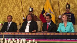 Jorge Glass, Vice President of Ecuador, Rafael Correa, President of Ecuador, Sultan Ahmed Bin Sulayem, DP World Group Chairman and CEO and Isabel Noboa, Chairwoman of Consorcio Nobis sign the new concession.