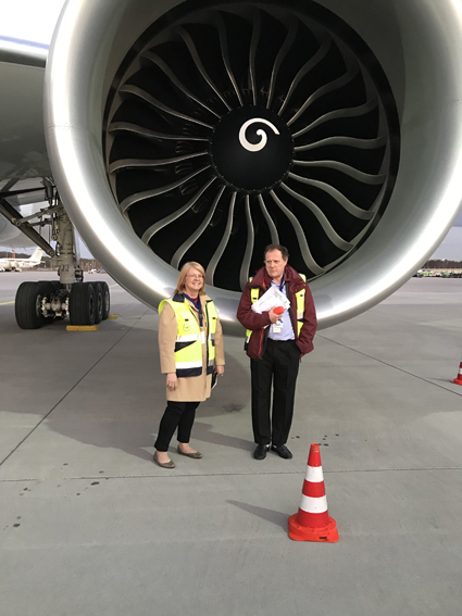 FBJNA editor Karen Thuermer and FBJ editor Chris Lewis examine Lufthansa’s new B777F during a press conference held in Frankfurt in mid-March. (photo by Mike Hawley)