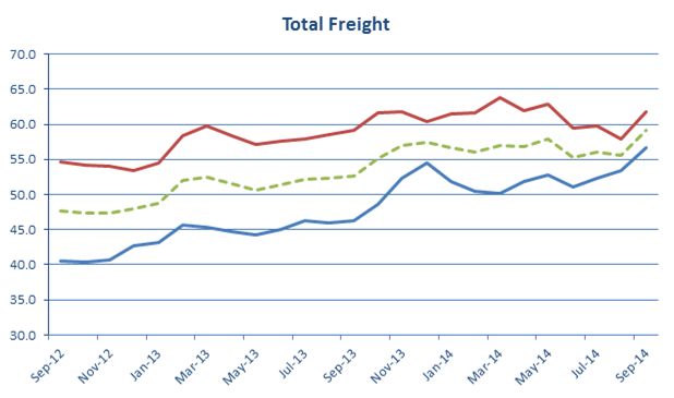 The overall airfreight logistics confidence index improved 2.9 points to 55.7. The expected situation increased 3.7 points to 58.4 while the present situation increased 2.1 points to 53.0. By trade lane, results were mixed for the present situation with the US lanes declining 2.8 from Europe and declining 0.1 to Europe, but Asia to Europe increasing 8.1 points to 59.6. Ti speculates that this might be because of the recent Apple iPhone 6 announcement? Rumors are that the company bought quite a bit of air cargo space to block out capacity for competitors.