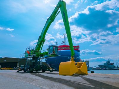 [ May 12, 2022 // Chris ]Portsmouth International Port terminal operator Portico has taken delivery of a Sennebogen material handler. The 870 Mobile Special “E” is equipped with a banana boom and stick with 24 metre reach for cargoes such as grain and aggregates.