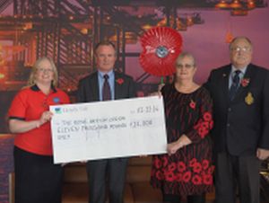 Maritime Transport’s group managing director, John Williams(second left) presents Royal British Legion community fundraiser Mandi Cox-Osborne (left) and Poppy Appeal organisers for Felixstowe Dawn and Stephen Kemp with a donation for £11,000.