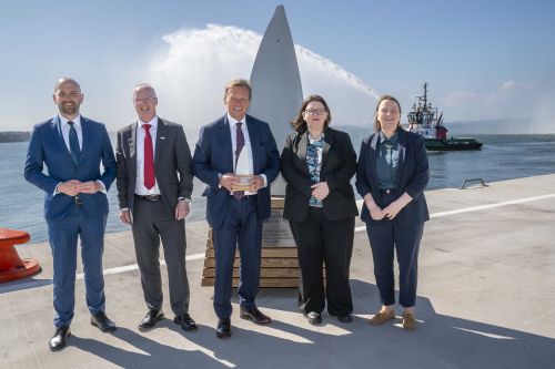 Pictured L-R: Ben Macpherson MSP, Stuart Wallace, CEO of Forth Ports, Charles Hammond OBE, Kirsty McNeill MP, Parliamentary Under Secretary of State for Scotland, Tracey Gilbert, MP for Leith, at the unveiling of a sculpture marking the naming of the Charles Hammond Berth at the Leith Renewables Hub, with the Kittiwake Tug in the background providing the salute with its water cannons.