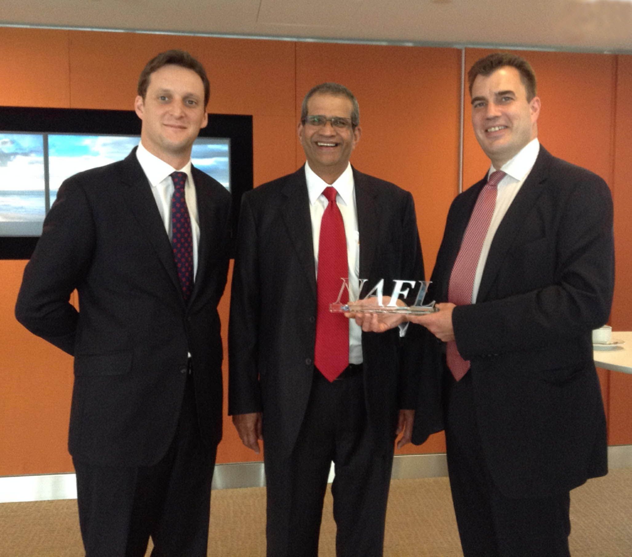 David Phillips (middle), chairman of the NAFL and CEO of Freight Systems LLC presents Julien Horn (left) and Andrew Kemp (right) from TT Club with an award in recognition of their expertise.