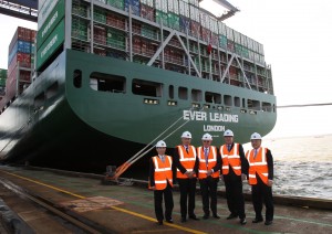 [ October 17, 2012 // Chris ]New shipping minister Stephen Hammond made his first visit to the Port of Felixstowe on 17 October. Whilst at the port, Mr Hammond also viewed Evergreen’s 8,452teu Ever Leading which was on her maiden voyage to the UK.