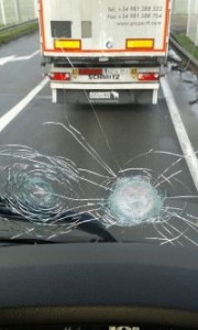 [ December 17, 2015 // Chris ]Freight Transport Association Ireland (FTAI) released photographs of a truck damaged by stone-throwing migrants in Calais. The windscreen of the Virginia International Logistics lorry was cracked in two places in the attack.
