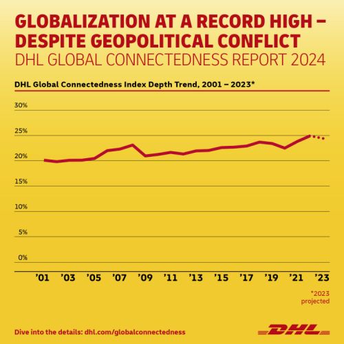 Geopolitics has had little effect on the trend towards globalisation, except in a few specific cases says DHL in the 2024 edition of its Global Connectedness Report, due to be published on 15 March.