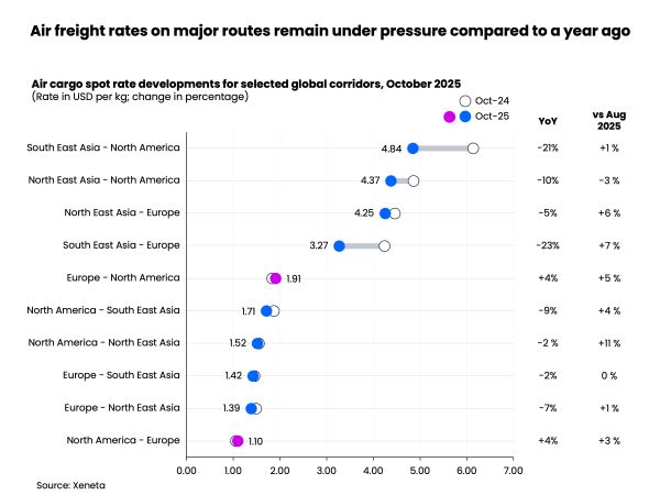 Across the top three global trade lanes, air cargo peak season growth momentum remained subdued in October. Adjusting for distortions from Super Typhoon Ragasa by averaging late-September and Golden Week volumes, Asia Pacific to Europe cargo demand rose +11% in October versus August – well below the +16% gain recorded in the same period last year. Corresponding spot rates climbed +5%, but were well below the +9% rise seen a year earlier.