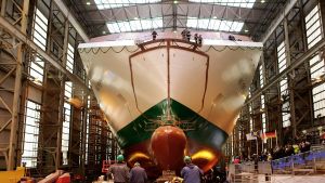 Irish Ferries’ latest vessel was named WB Yeats when the completed hull was on 19 January at the Flensburger shipyard in Germany. The €150 million, 54,985 gross tonnes cruise ferry will arrive in Dublin next July when it will enter year-round service on Ireland – France and Dublin – Holyhead routesThe Flensburg shipyard will shortly start work on a second, even larger cruise ferry for delivery in 2020 which was recently commissioned by Irish Ferries parent, Irish Continental Group for  €165.2 million.