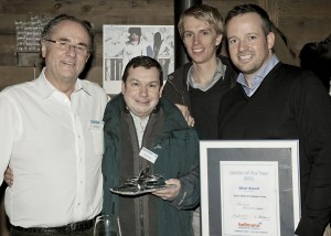 From left: Klaus Hellmann (far left) presents the Silver Global Carrier of the Year Award to Safmarine’s Stephen Knight, Stef Damen, and Sammy Reynaert.