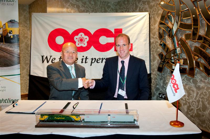 Freightliner ran a special dedicated OOCL service on 5 October to mark the continued partnership between the two companies. The Southampton bound service departed Freightliner’s Trafford Park Terminal in Manchester with 52 OOCL containers and followed the contract signing between OOCL UK branch managing director Peter Ip and Freightliner MD, Adam Cunliffe for the second ten-year agreement. OOCL has committed to increase capacity by 50% with daily links between Southampton and Birmingham, Leeds and Manchester.