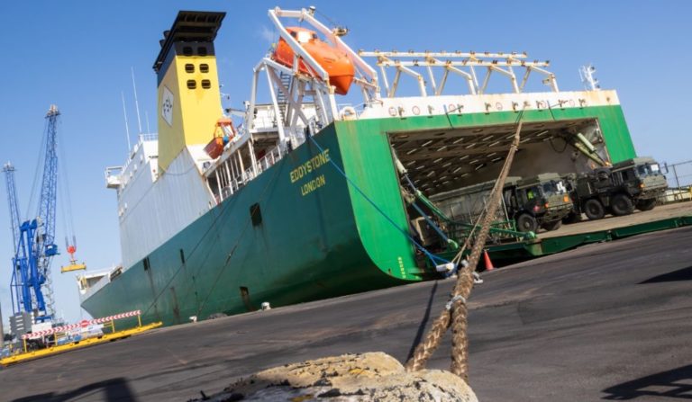 The 23,000-tonne Eddystone, a strategic equipment transport vessel, called on 29/30 March, transporting hundreds of vehicles and pieces of equipment belonging to 7 Light Mechanised Brigade Combat Team (the Desert Rats) back to the UK from the largest NATO deployment of the year, Exercise Steadfast Dart.