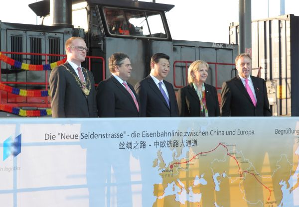 Chinese President Xi Jinping, accompanied by the German Vice Chancellor Siegmar Gabriel and Hannelore Kraft, Prime Minister of North Rhine Westphalia, visited the Port of Duisburg and its logistics hub logport on 29 March. The delegation welcomed the arrival of the Yuxinou Train from Chongqing. The Chinese president was on his way to trade talks in Brussels.