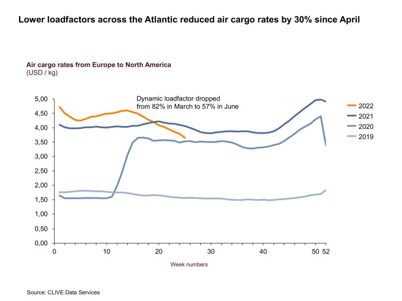 [ July 6, 2022 // Chris Lewis ]Extra summer airline capacity put downward pressure on freight rates, especially on the North Atlantic which has seen a 30% decline over the past three months, said CLIVE Data Services, part of Xeneta.