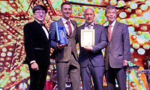 (l to r) Thomas Sim, Chairman of FIATA’s ABVT Group; Award Winner Louis Perrin, Hemisphere Freight (UK); Michael Yarwood of Sponsor, TT Club; Huxiang Zhao, immediate past President, FIATA