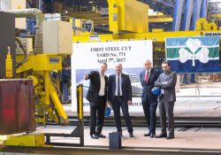 [ April 10, 2017 // Chris ]Irish Continental Group chief executive, Eamonn Rothwell and managing director of its Irish Ferries, arm Andrew Sheen, cut the first metal for a new cruise ferry at the Flensburger shipyard on 7 April. The €144million vessel is scheduled for delivery in mid 2018 and will have space for 2,800 lane metres of freight (165 vehicles).